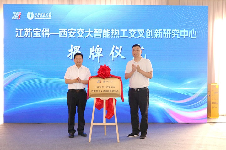 黃忠德與季震為“江蘇寶得—西安交大智能熱工交叉創(chuàng)新研究中心”揭牌。